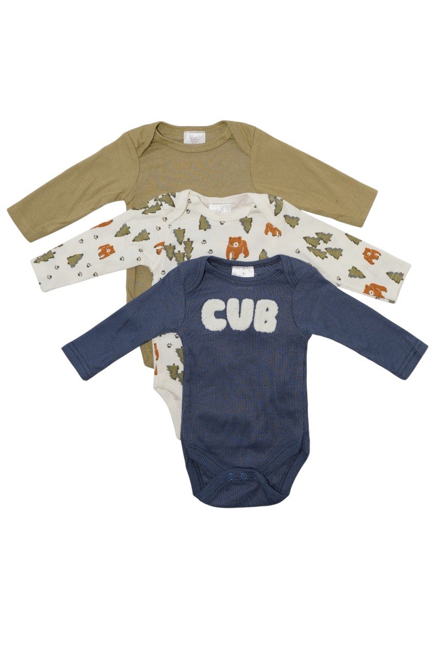 Alt Text: Set of three baby bodysuits with pine tree print and solid colors – long sleeve and cotton